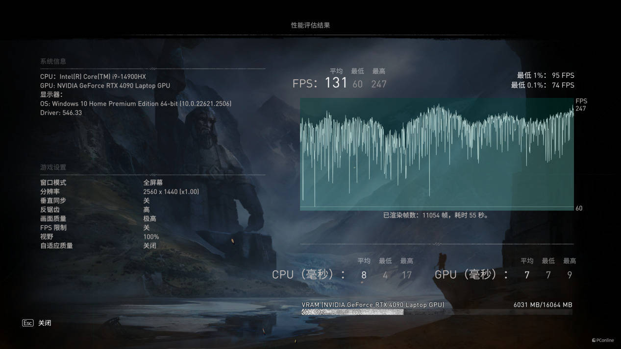 接下来是《刺客信条:英灵殿》,2.5K分辨率,画质为预设的“最高”画质,运行游戏内置的BenchMark,平均帧数为:131帧。