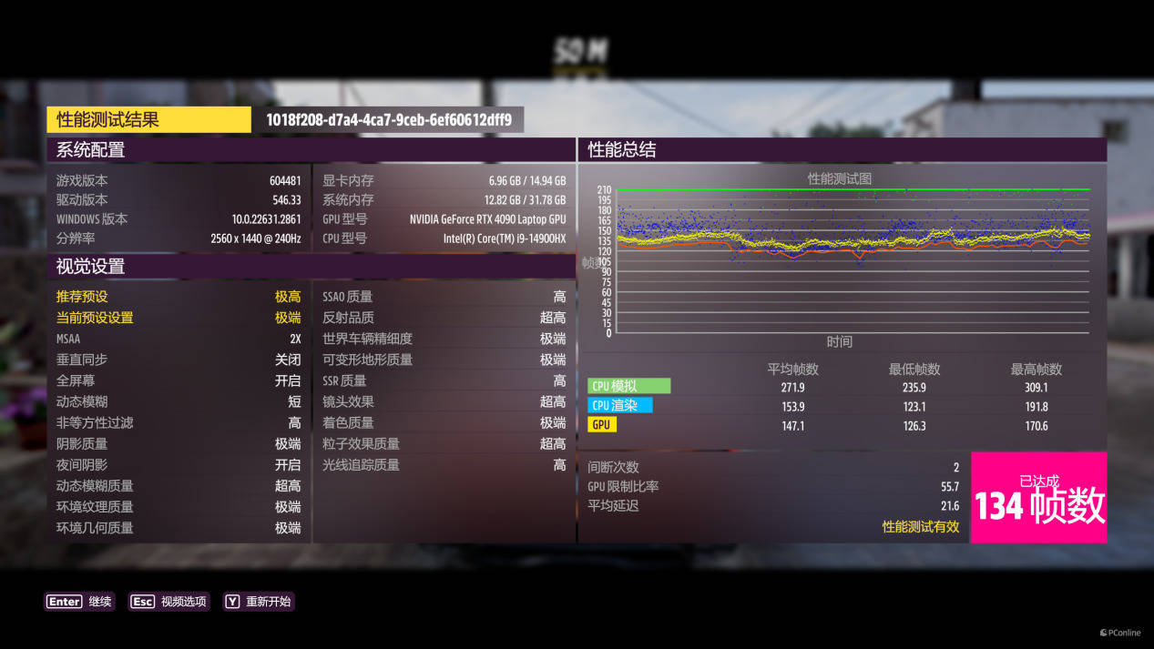 竞速类大作《地平线5》,将画质调整为预设的“极端”,2.5K画质下运行游戏内置的BenchMark,平均帧数为134帧。