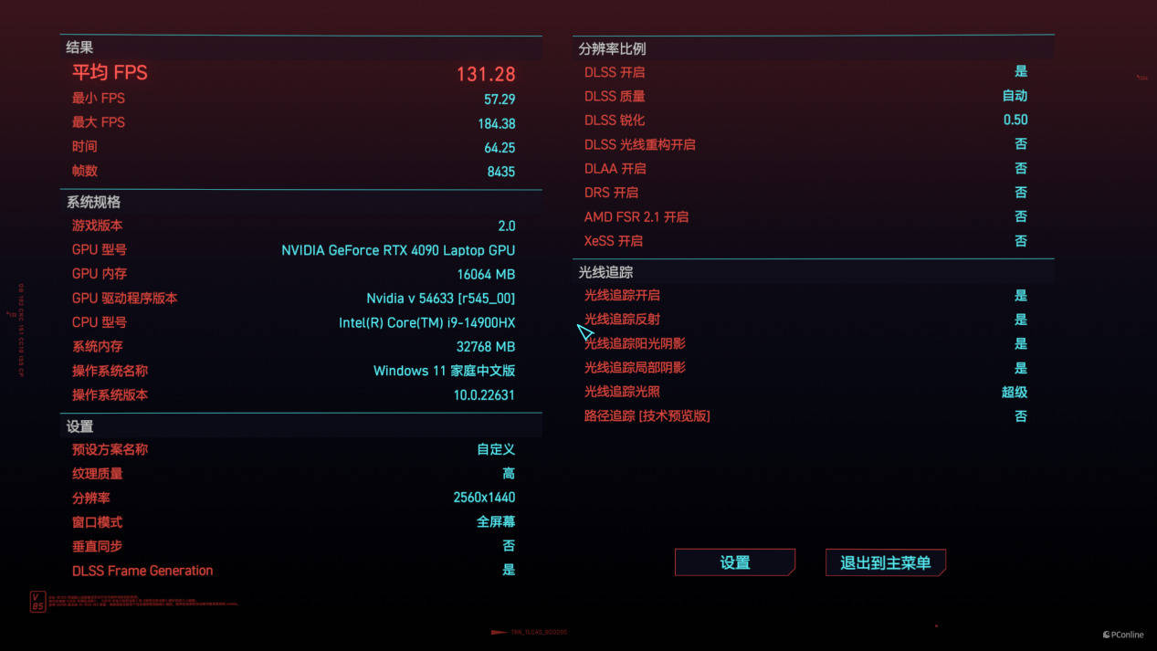超高画质极3A大作《赛博朋克2077》,画质调整为预设的“光线追踪:超级”,DLSS挡位开启至“自动”挡位并开启DLSS Frame Generation,运行游戏内置的BenchMark,平均帧数为131.28。