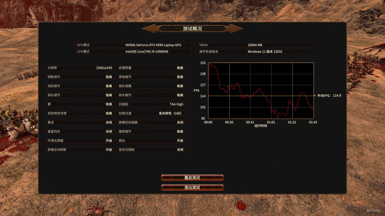 在《全面战争:战锤3》中,预设“极高画质”,2.5K分辨率,运行游戏内置的BenchMark,在标准战斗场景下,平均帧数为114.9帧。