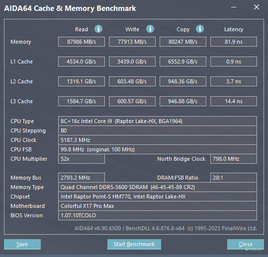 使用AIDA 64中的Cache&Memory BenchMark对双通道32GB DDR5 5600MHz进行测试,读、写、复制的速度分别为87986MB/S、77913MB/S、80247MB/S,延迟81.9ns,在保证了读写速度极快的同时,进一步压低了内存延迟、消除内存对性能的瓶颈。