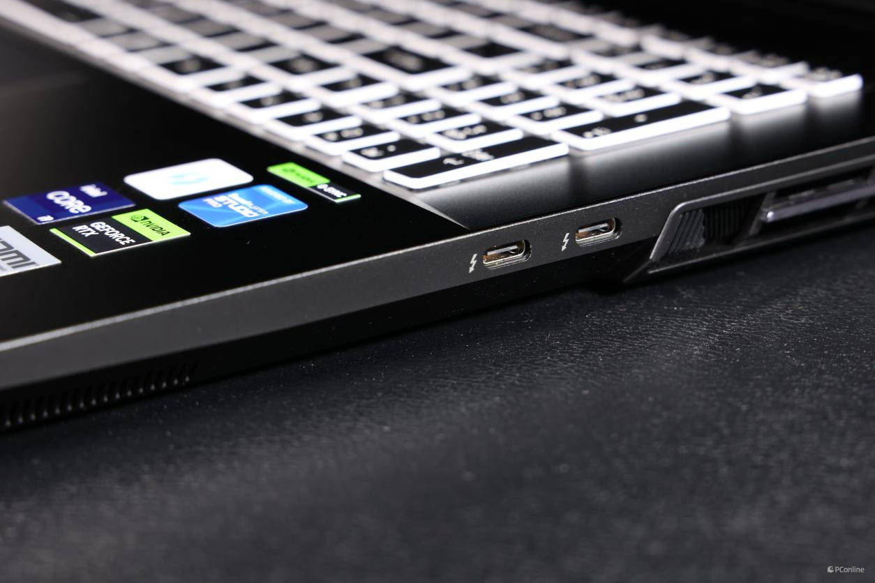 最后来看看接口情况,机身的两侧及后侧都有接口分布。机身左侧分别为两个USB 3.2接口、一个二合一耳机接口、一个二合一数字音频接口;机身右侧为两个雷电4接口(其中一个支持PD充电);机身后侧依次为一个mini DP接口、HDMI接口、有线网络接口、电源接口。