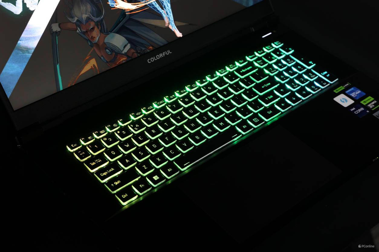 来到C面,键盘支持RGB背光,可在系统中的Control Center进行调节,提供了多种灯光模式,共有4档亮度调节。键盘带有小键盘区域,方向键为正常大小,电源按键独立于整个键盘区域位于右上角,键程较长,回弹比较轻快。