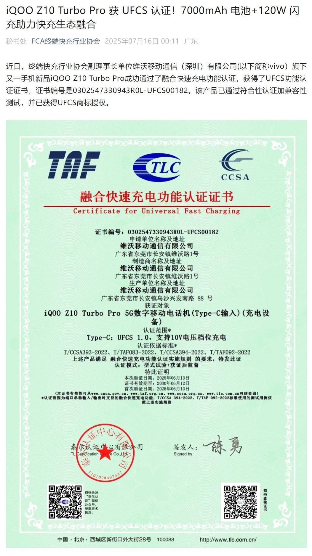 iQOO Z10 Turbo Pro获UFCS认证....推荐人:丁丁小编 发布时间:2025-07-16 17:02:59