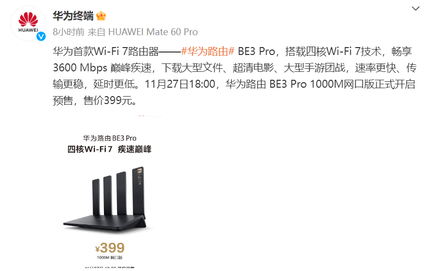 Wi-Fi 7时代来临!华为路由 BE3 Pro开....推荐人:丁丁小编 发布时间:2025-06-11 03:26:58