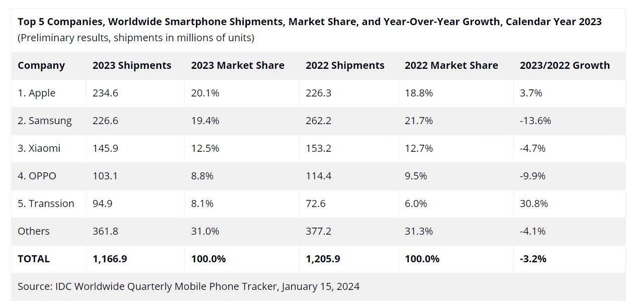 — 2023年全球智能手机出货量:中国品牌占据前五,苹果位列第一! —