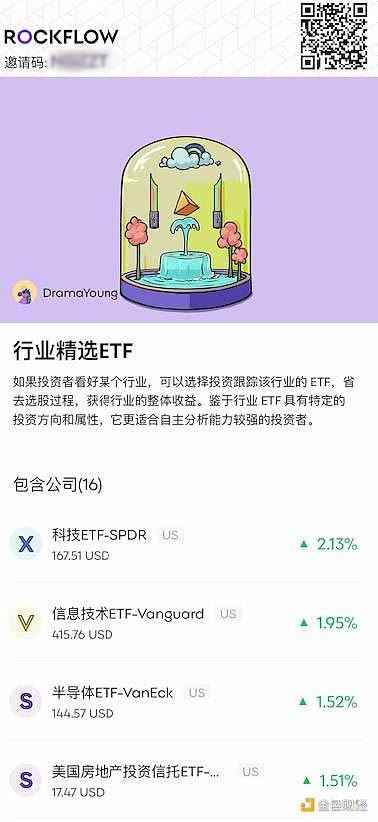 当前美股的 10 个大类行业包括可选消费、必选消费、能源、金融、医疗、工业、原材料、科技、公共事业、房地产,其跟踪标的都是道琼斯、标普指数成分股。RockFlow 投研团队最新推出的“行业精选 ETF”,为大家选出了集高流动性和代表性于一身的优质行业 ETF(出于整体阅读体验,下图仅部分展示):