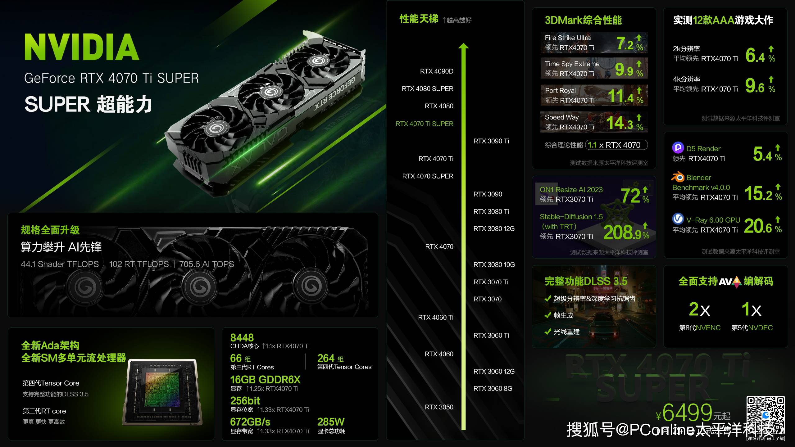 另外,最直观的还是它的售价,NVIDIA GeForce RTX 4070 Ti SUPER为6499元,而此前RTX 4070 Ti的价格也是6499元,新显卡不仅增加了CUDA数量,还带来了更大的显存与显存带宽,这下真的可以说是“加量不加价”了,至于NVIDIA GeForce RTX 4070 Ti SUPER究竟有怎么样的表现,我们接着看。