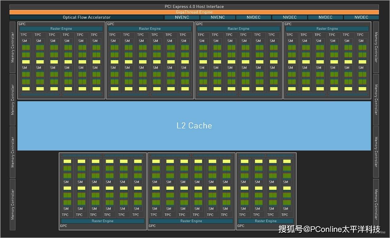 而RTX 4080上的也不是完整版的AD103,其拥有4个完整规格的GPC(图形处理集群,每个内建6个TPC),与3个非完整的GPC(两个内建5个TPC,一个内建4个TPC),共组成38个TPC,SM单元则剩下76个,显存位宽还是完整的256Bit。