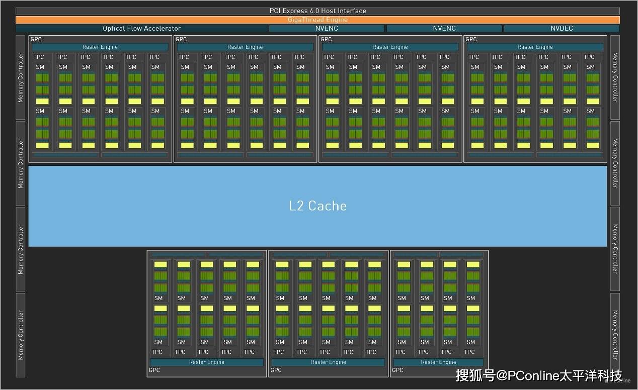 我们手上的NVIDIA GeForce RTX 4070 Ti SUPER同样是AD103核心,不过规格略有缩减,拥有4个完整规格的GPC(图形处理集群,每个内建6个TPC),与2个非完整的GPC,因此其SM单元也相应缩小为66个,不过好在这次显存位宽还是给到了256bit。