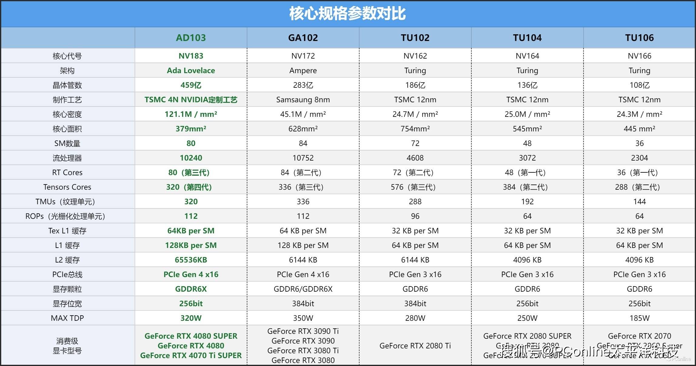 首先照例讲讲NVIDIA GeForce RTX 4070 Ti SUPER的规格,最大的改变还是这款显卡改用了AD103核心,完整的AD103核心应该包括7个GPC(图形处理集群)、40个TPC(纹理处理集群)、80个SM(流式多处理器)以及一个带有8个32Bit显存控制器的256Bit显存带宽。