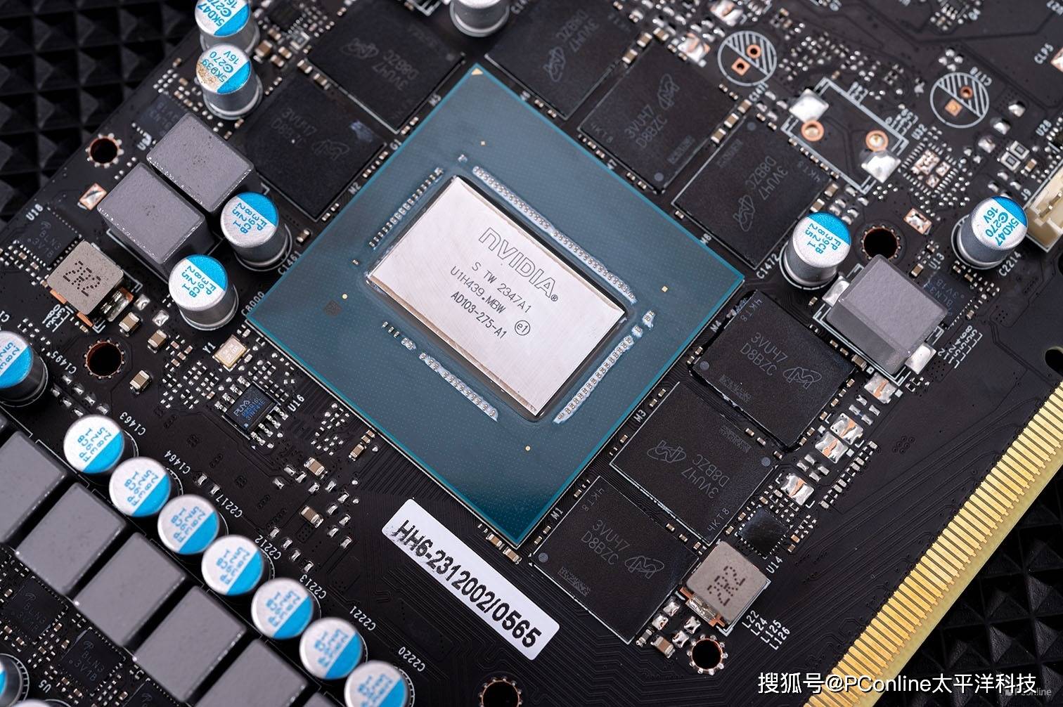 视角回到PCB的正面,正中央镶嵌着本次的主角——AD 103-275-A1核心,RTX 4080的同款芯片,由TSMC 4N工艺打造,295mm2的芯片面积内塞下了8448个CUDA 核心,相比原本的RTX 4070 Ti直接多了10%的CUDA,因此它的性能表现也更加出色,开启DLSS 3以后,直接秒杀上代旗舰RTX 3090 Ti。