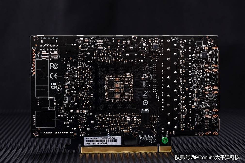 PWM供电芯片则被安排在PCB背面,型号为uP9512R,能够同时管理核心供电及显存供电。