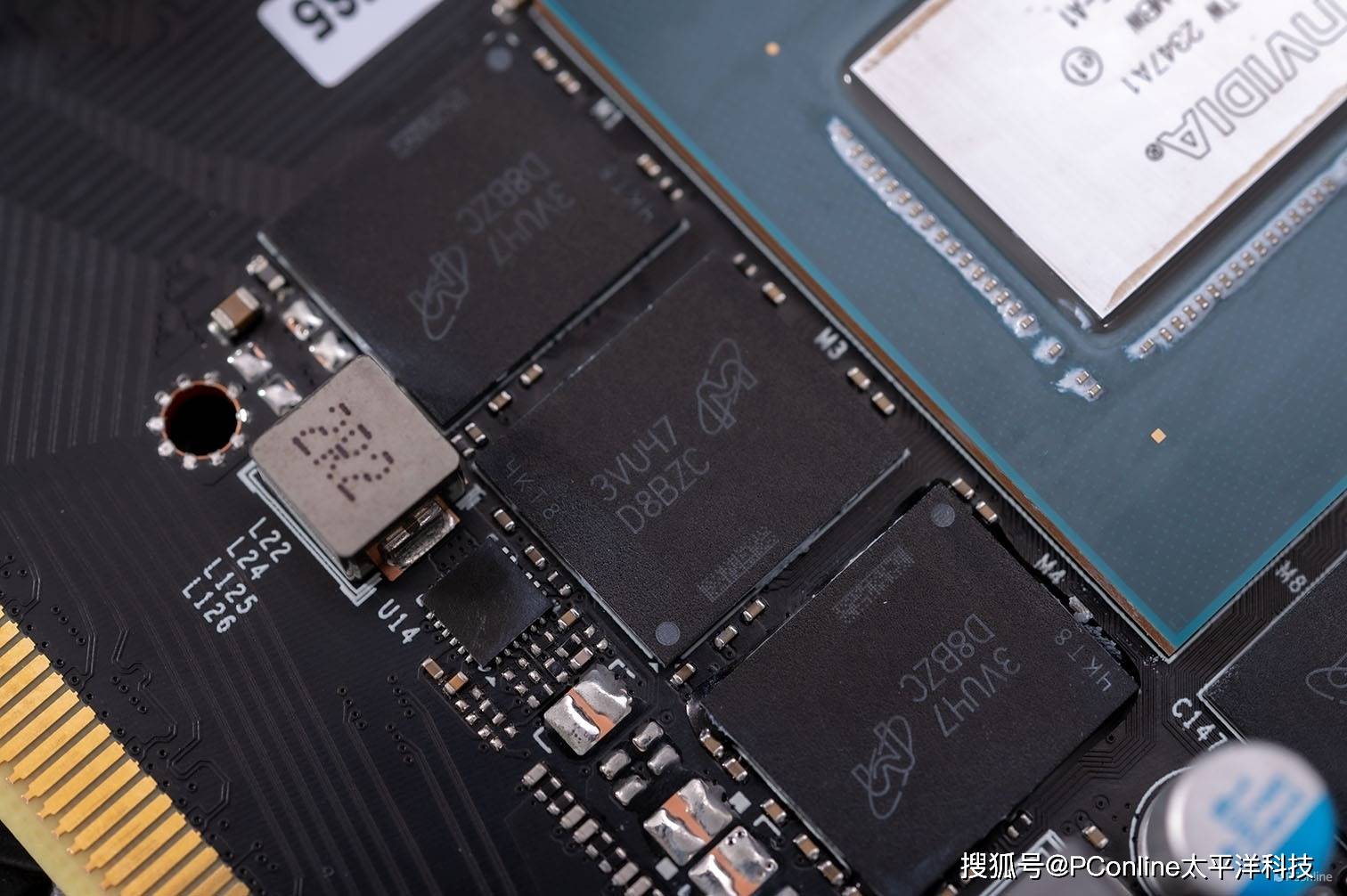 核心四周为8颗显存,它们是由美光提供的GDDR6X显存,型号是3VU47 D8BZC,单颗显存容量为2GB,8颗显存共组成16GB。并且它们可以实现21Gbps的等效频率,让这款显卡能够应对更多复杂的场景。