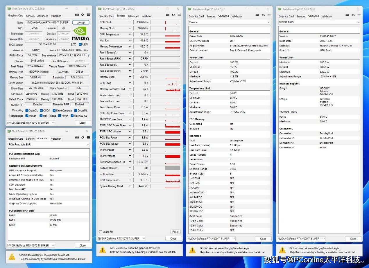 理论性能测试前,照例在GPU-Z中看看这款显卡的参数信息,影驰RTX 4070 Ti SUPER大将不仅与RTX 4070 Ti采用了不同的核心,连频率也不一样了。这款显卡的基础频率为2340MHz,比RTX 4070 Ti高了30MHz,Boost频率也去到了2610MHz。并且虽然说影驰RTX 4070 Ti SUPER大将是MSRP版本,TDP为285W,但实际上这款显卡的TGP给到了最大的360W。