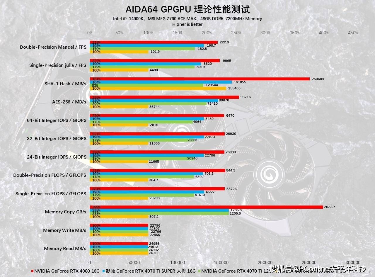 科学计算方面,影驰RTX 4070 Ti SUPER大将同样展现了新显卡的超强实力,其单精度和双精度浮点运算基本是前代的90%以上,几乎是翻倍的表现,整体性能领先更是超过2倍的提升,真的相当惊人,不过距离RTX 4080则还有不小的距离。