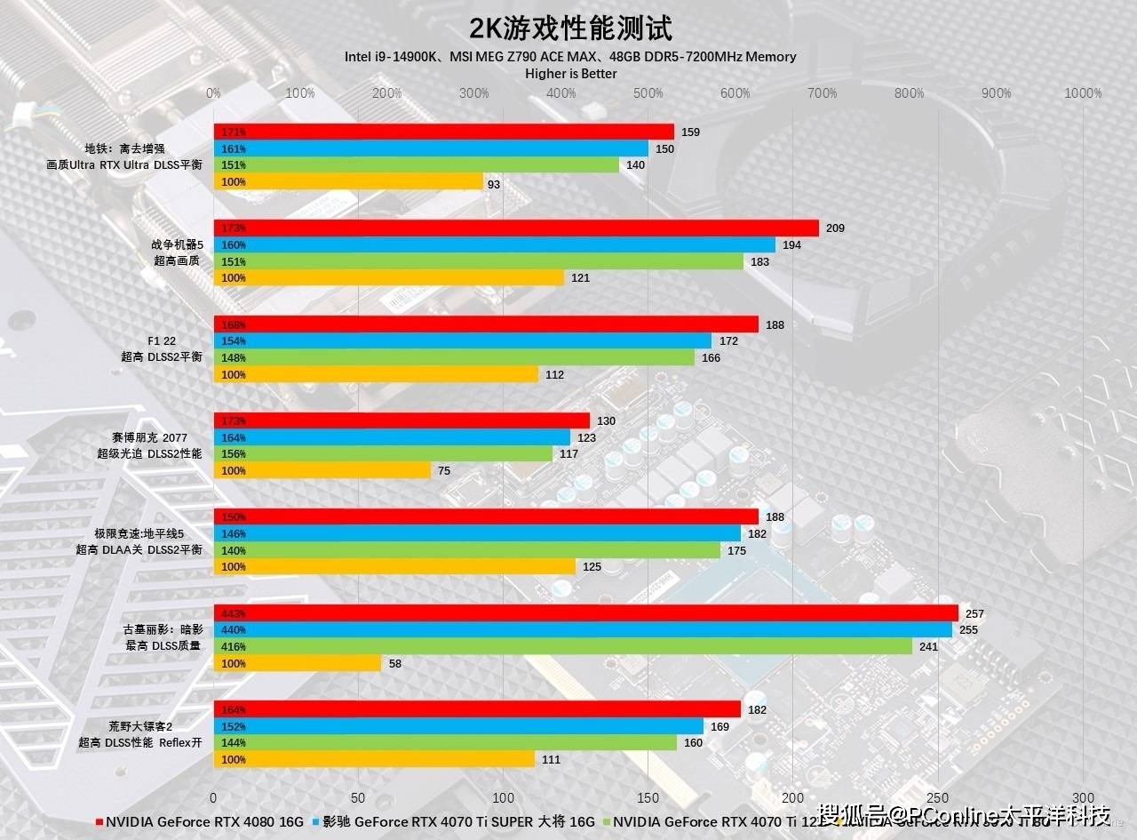 2K分辨率,大家都开启DLSS 2,影驰RTX 4070 Ti SUPER大将的表现已经相当出色了。大部分游戏光靠DLSS 2就能实现高刷体验,对比同是40系的两位,影驰RTX 4070 Ti SUPER大将很好的卡在了RTX 4070 Ti与RTX 4080中间,领先前者约10%左右,与后者的差距也不算太远。