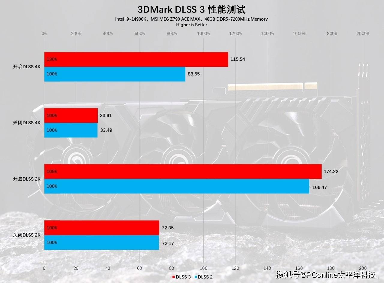 技术介绍了那么多,还要看“疗效”怎么样。在3DMark的DLSS测试里,有DLSS 3的加持下,影驰RTX 4070 Ti SUPER大将在2K分辨率下,开关DLSS 3的差距接近3倍以上,174 FPS的表现也告诉你它确实能够胜任2K高刷游戏这份殊荣,比起之前的RTX 4070 Ti也要高出近20 FPS以上!4K分辨率也不虚,115 FPS的表现差点就实现了4K高刷玩3A大作的成就。