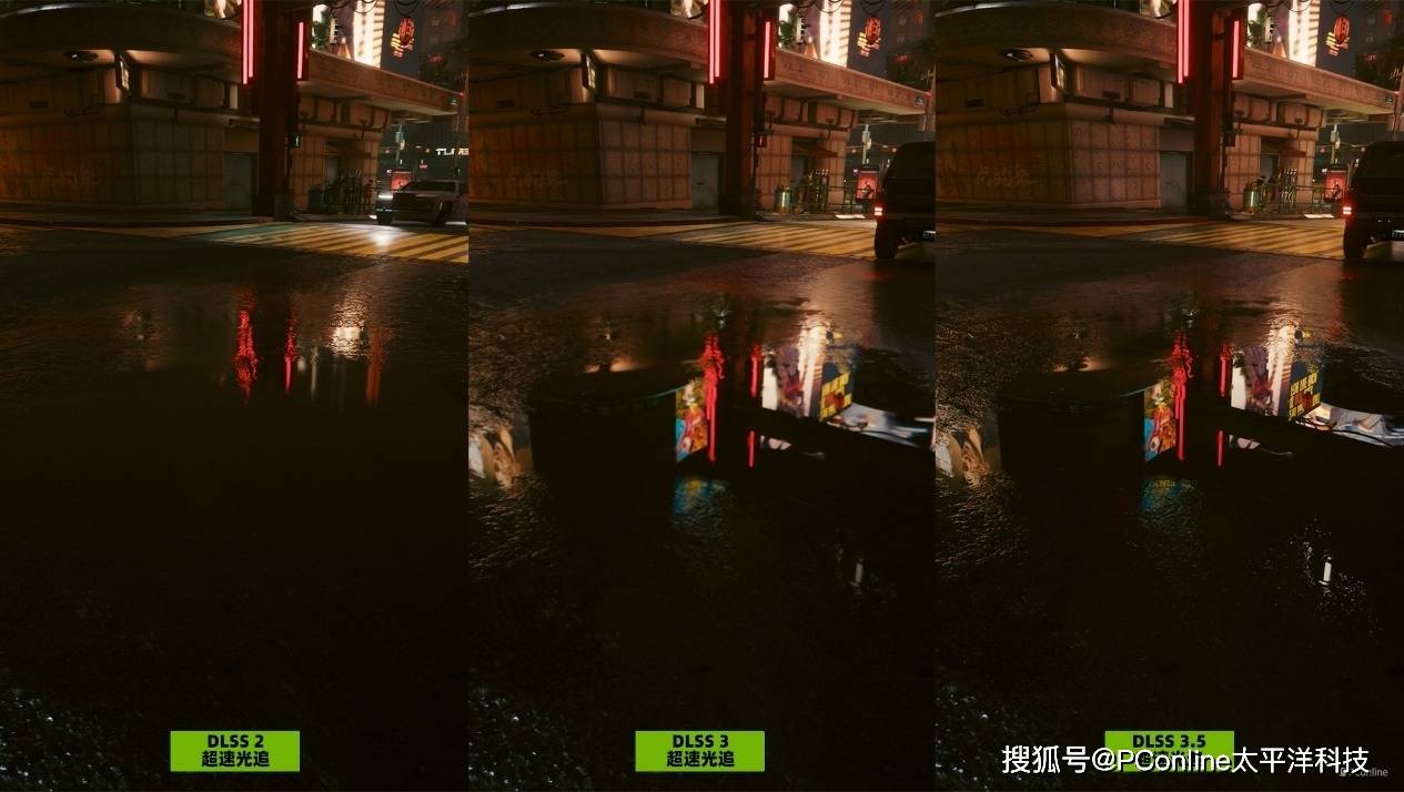 另外《赛博朋克2077》这款游戏也支持了最新的DLSS 3.5,我们也用NVIDIA GeForce RTX 4070 SUPER进行了实测。给大家感受一下DLSS 3.5的光线重建技术,打开光线重建后,地面上的倒影比关闭时拥有了更多的细节,建筑和广告牌上的轮廓十分锐利,文字也清晰可辨。在带有反射的场景里面,光线重建都能带来非常惊艳的效果。
