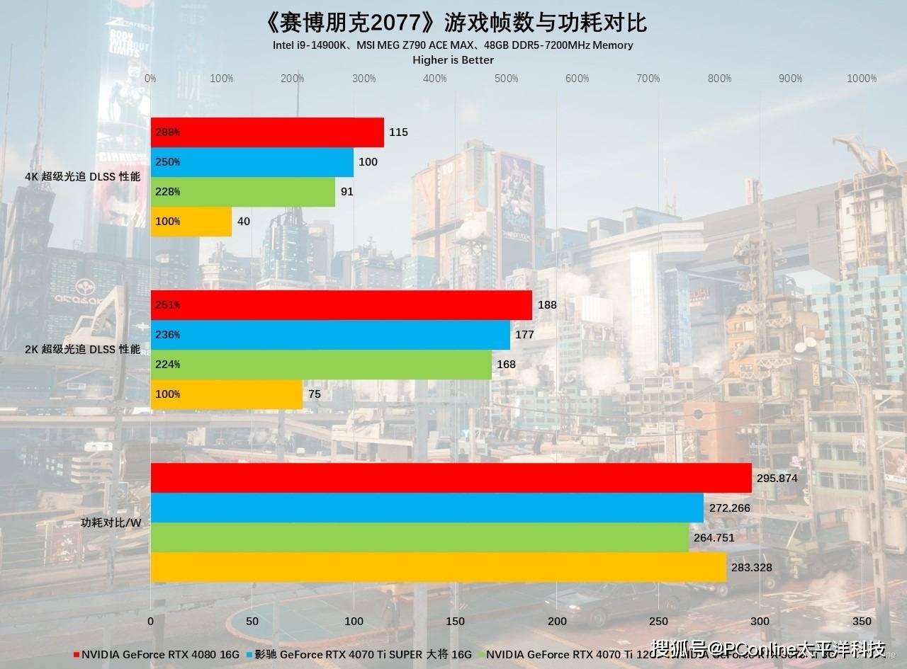 游戏实测方面我们也是直接请来了有“显卡杀手”之称的《赛博朋克2077》,在2K乃至4K分辨率下,影驰RTX 4070 Ti SUPER大将都是轻轻松松,有了DLSS 3以后,这款显卡的表现是前代显卡无法企及的高度,性能差距高达100帧以上,并且得益于RTX 40系出色的能耗比,影驰RTX 4070 Ti SUPER大将在游戏中其实功耗也不高,甚至比前代的RTX 3070 Ti还要低一些,但是却有翻倍的性能表现,完全是新时代的游戏神器。
