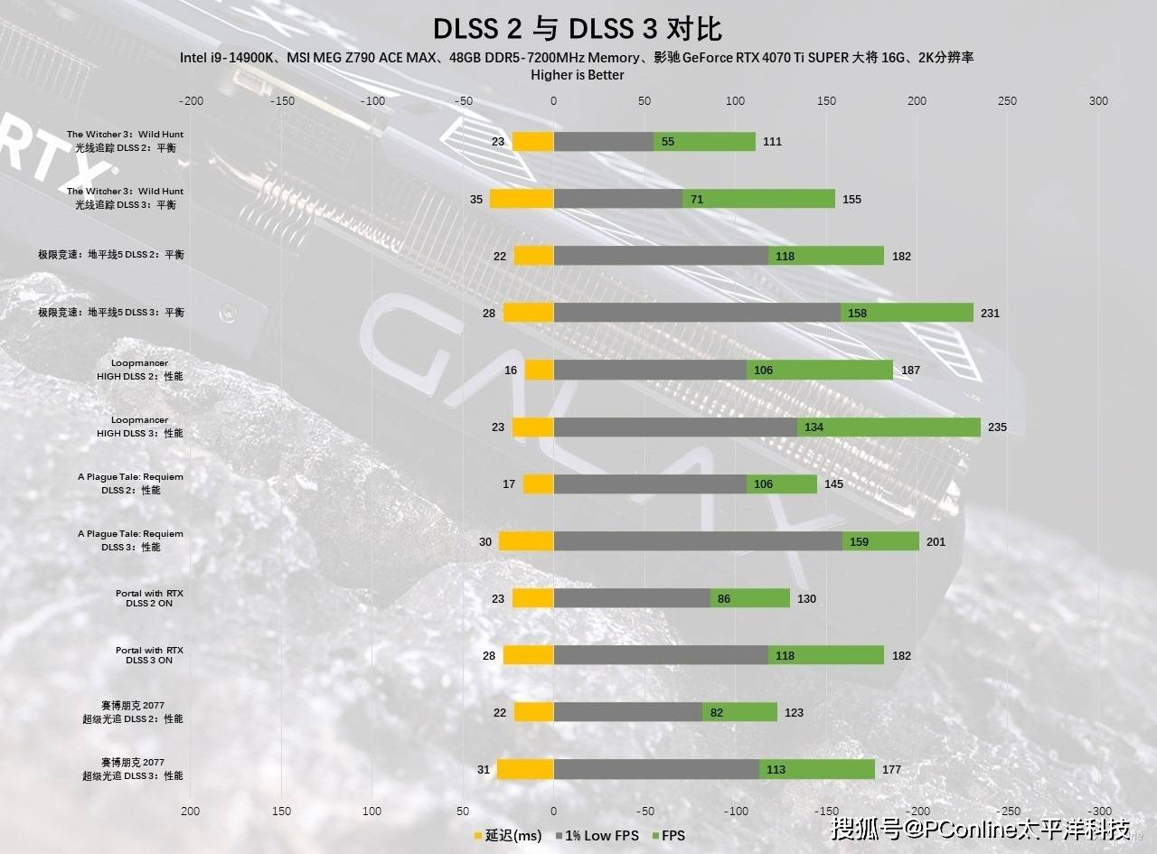 DLSS 3还是相当有用的,这里我们用DLSS 2与DLSS 3进行对比,基本上影驰RTX 4070 Ti SUPER大将在开启DLSS 3后,游戏帧数都有不同程度的提升,一些优化好的游戏,甚至能够实现翻倍的性能体验,另外DLSS 3还有一个作用就是开启以后,游戏的1%Low帧会有一定程度的增强,反应在游戏中就是你的游戏体验更丝滑,卡顿掉帧的情况更少。
