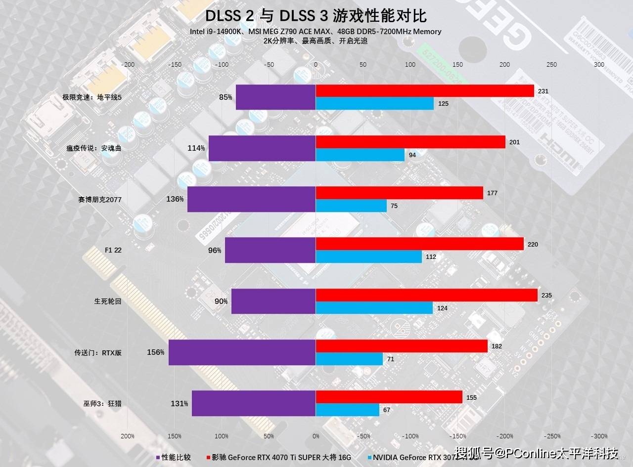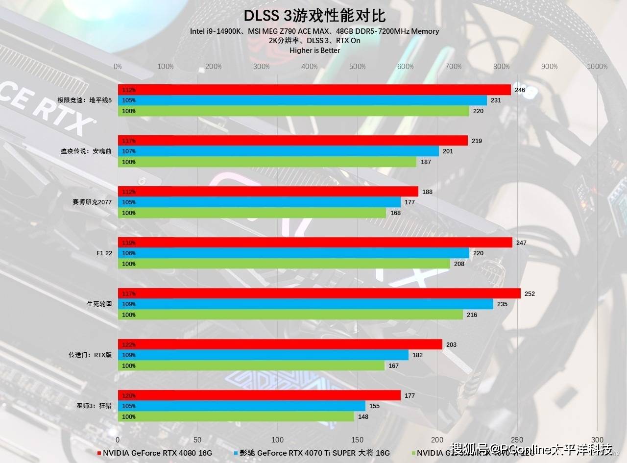上面还只是跟自己对比,如果开启DLSS 3后跟前代显卡对比,性能差距更大。影驰RTX 4070 Ti SUPER大将在2K分辨率下,开启DLSS 3后,在大多数游戏中都要比RTX 3070 Ti强1倍以上,你可能没有什么概念,大概就是二者的游戏帧数可以差100-120帧以上,领先整整一代显卡的身位,这就是DLSS 3的魅力。以前你勉强流畅玩的游戏,现在轻易就能获得高刷电竞般的体验。
