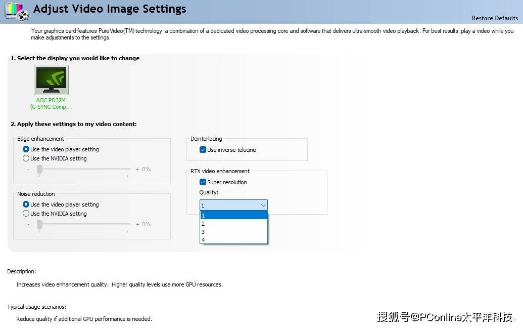 只要你是RTX 30系或RTX 40系的显卡,在NVIDIA控制面板中找到视频图像设置,就可以手动开启RTX Video enhancement即RTX视频超分辨率(RTX VSR)技术,其中分为1-4档调节,数字越大质量越好。