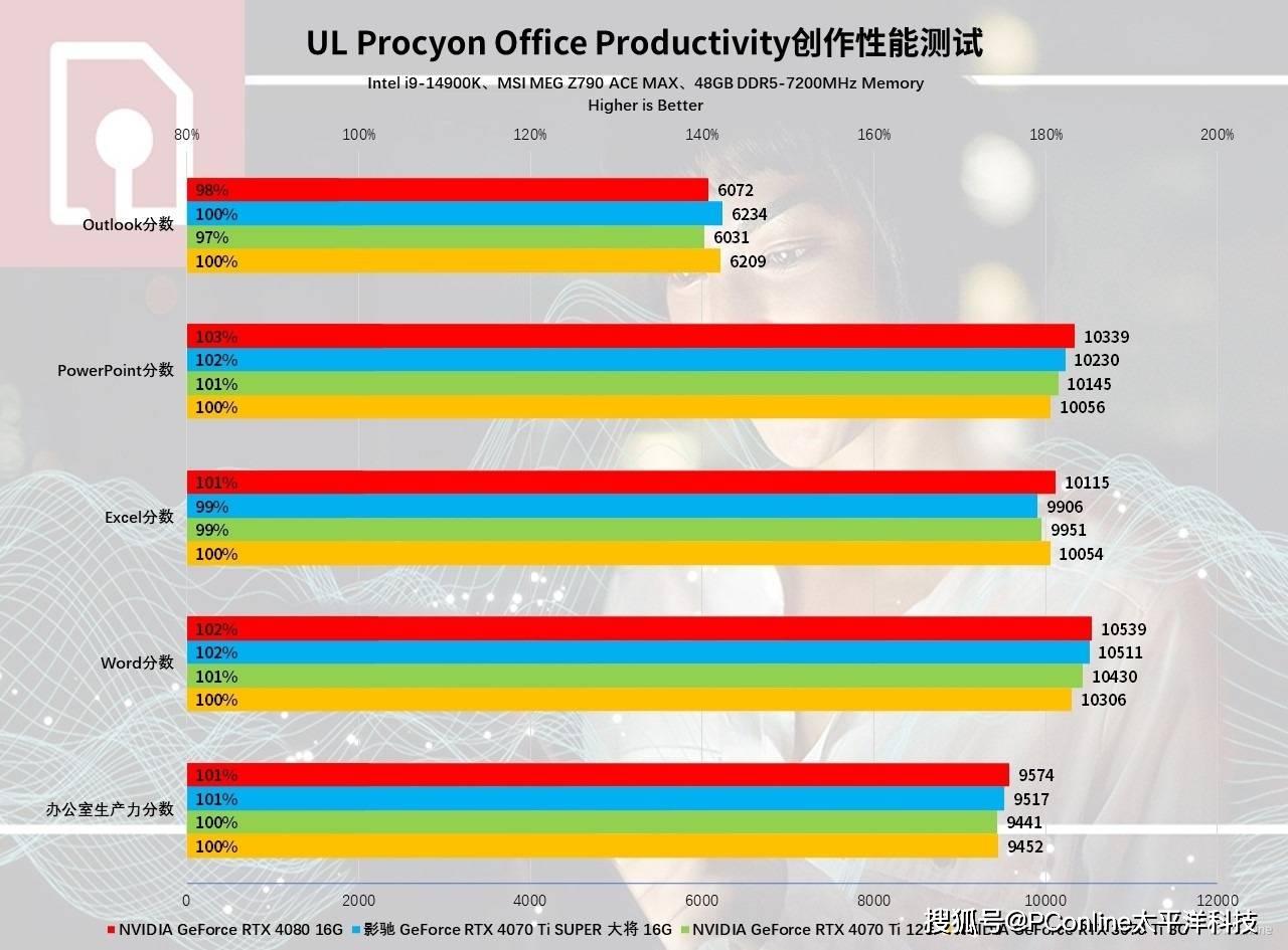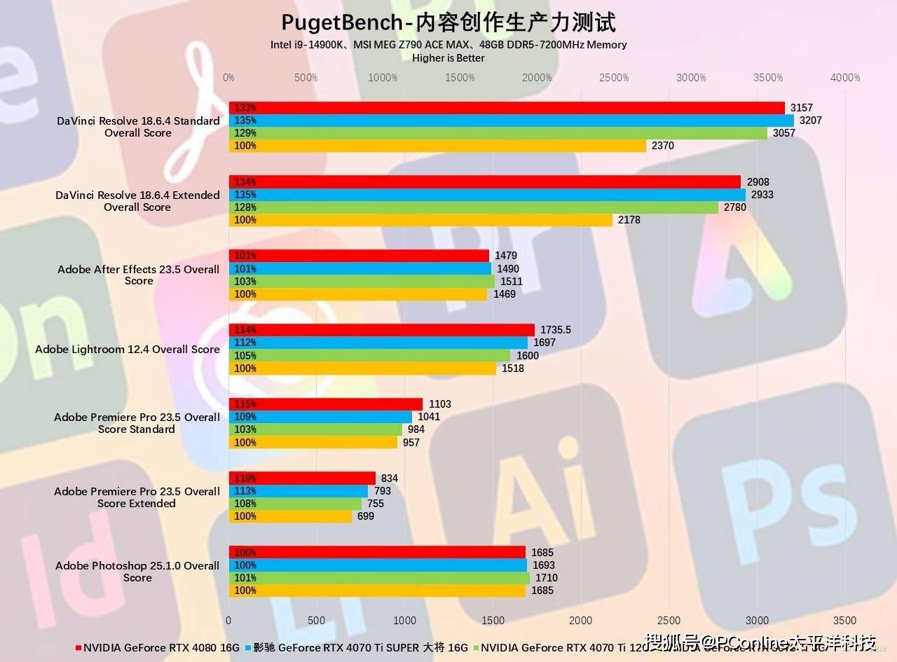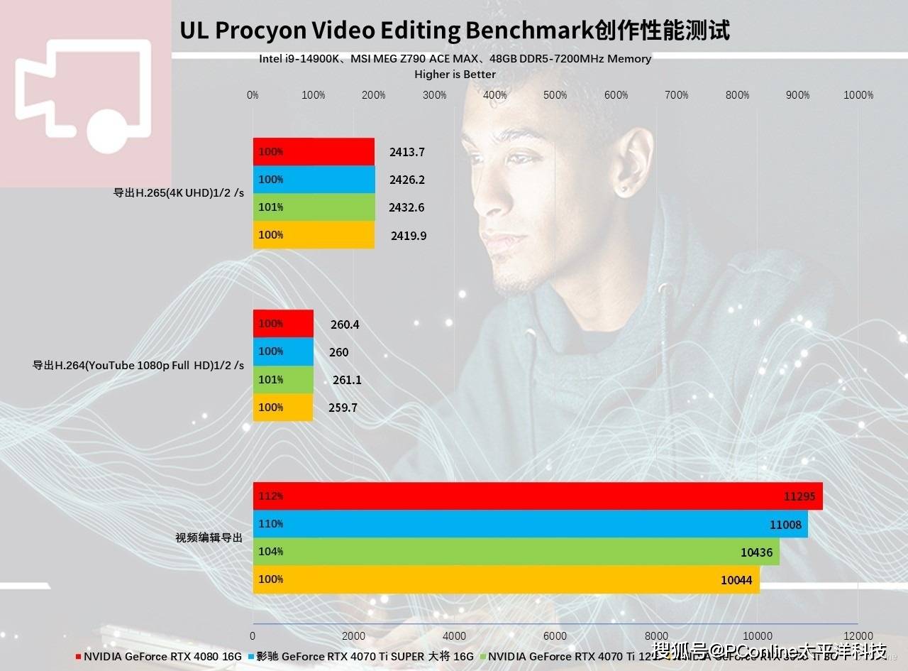难度更高的图像与视频编辑测试中,影驰RTX 4070 Ti SUPER大将也比前代的显卡强势不少,甚至视频编辑导出能达到10%以上。