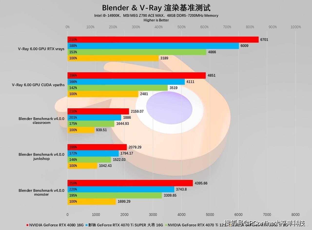 来点高级的创作测试,在N卡常用的Blender和V-Ray渲染软件中,影驰RTX 4070 Ti SUPER大将相比RTX 3070 Ti基本已经是性能翻倍的体验,如果对比RTX 4070 Ti,性能优势也有20%以上,不过还是由于规格原因,与RTX 4080还有20%左右的差距,但是以目前的表现来说,“SUPER”这个后缀真的让这款显卡有了更强的表现。