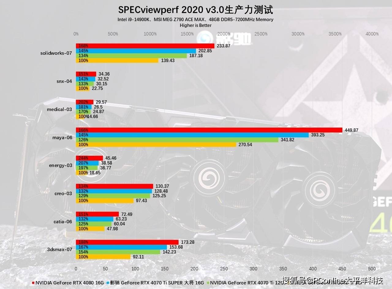 再看看工业领域的表现,SPEC 2020对多种应用进行了测试,可以比较全面的反应这张显卡的工业创作能力,实测结果可以看到,影驰RTX 4070 Ti SUPER大将遥遥领先,相比前代显卡,平均提升了40%以上的性能。
