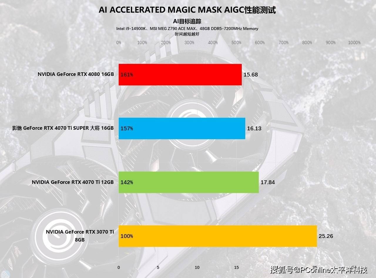 下面是基础的AI能力测试,使用达芬奇AI ACCELERATED MAGIC MASK测试时,可以看到影驰RTX 4070 Ti SUPER大将的完成时间为16秒,而前代的RTX 3070 Ti则是25秒,并且单从效率上来看,影驰RTX 4070 Ti SUPER大将也比RTX 4070 Ti快了15%左右。