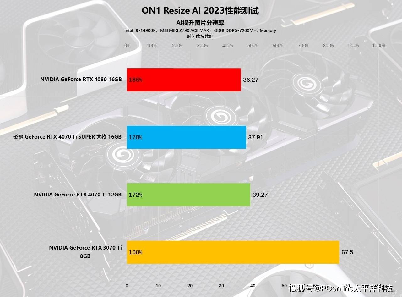 AI也经常被玩家用来放大图片,因此我们也是使用ON1 Resize AI 2023将5张图片提升200%分辨率,此时影驰RTX 4070 Ti SUPER大将的速度为平均7.5秒一张,而上代的RTX 3070 Ti为13.5秒,超过70%的性能提升你就知道新的SUPER显卡有多厉害了。