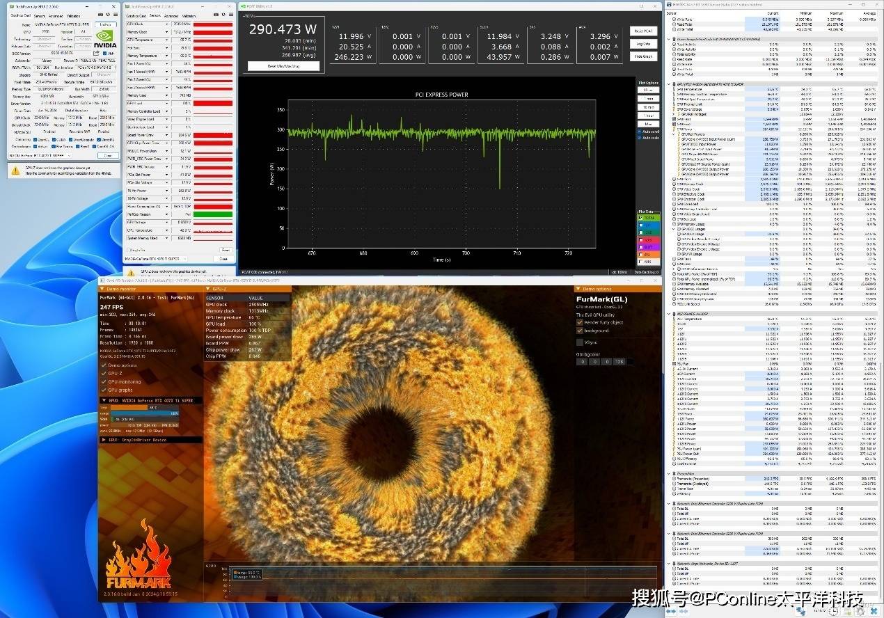 Furmark只能说明显卡在重度负载的情况下功耗表现,我们还使用HWINFO与PCAT工具对显卡对行功耗的监控。从不同的应用软件来看,影驰RTX 4070 Ti SUPER大将显卡功耗表现基本都是控制在TDP 285W以内,相较更高级别的显卡的确是有着更好的功耗表现。
