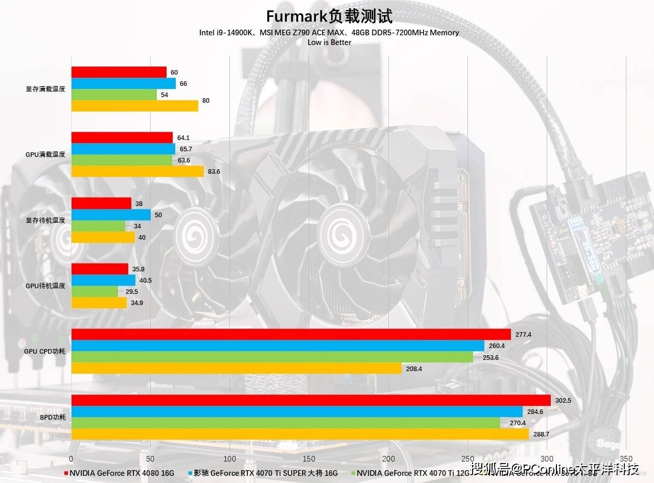 相较几款横向对比的显卡,在Furmark烤机方面,影驰RTX 4070 Ti SUPER大将的功耗也维持在较低的水平。再想想它的性能表现,你就知道什么叫做“花小力办大事”。