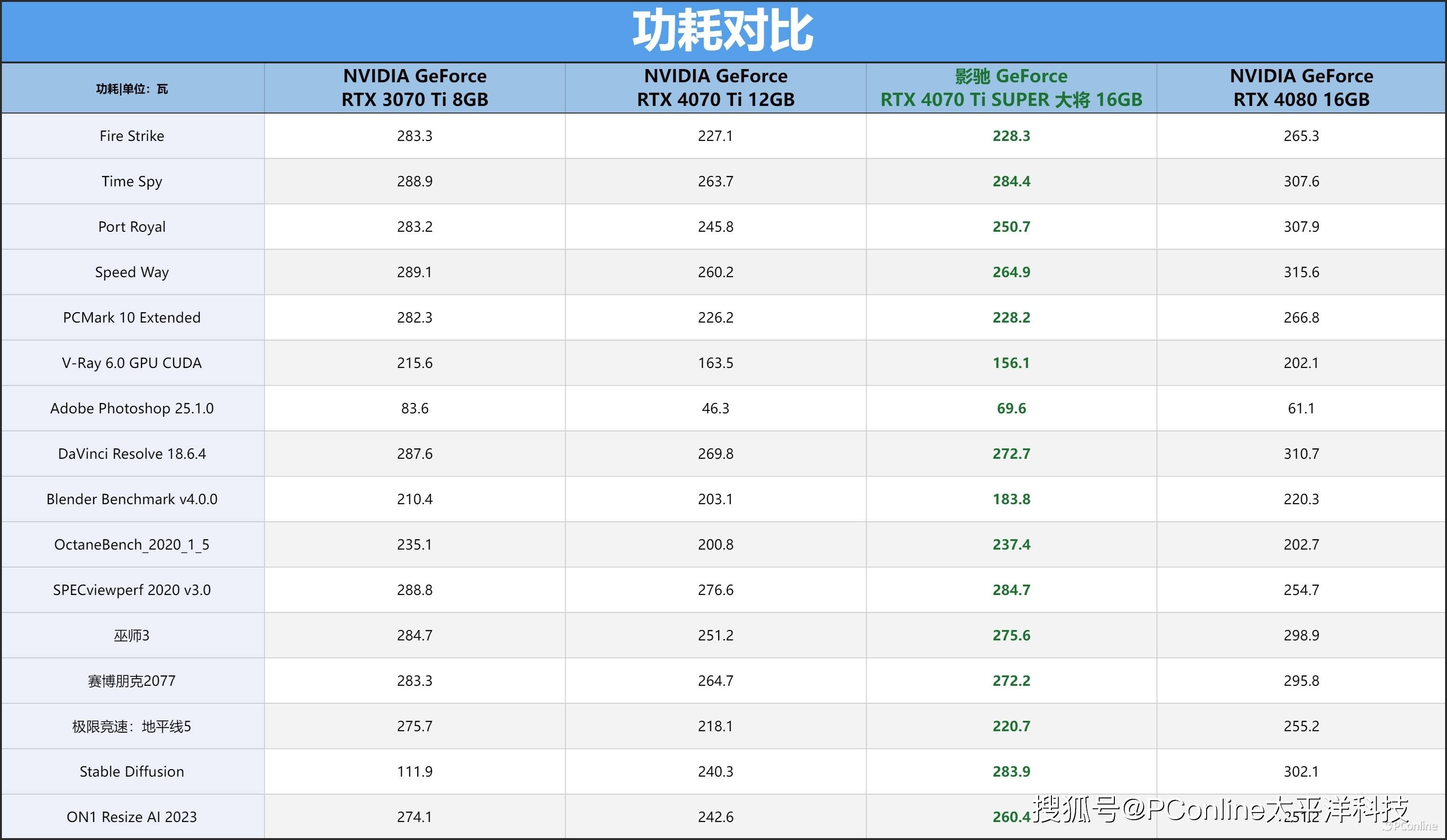 以下是部分测试项目与游戏的功耗对比,从实测数据可以看出老黄的RTX 40系显卡确实非同一般,不仅性能强势,功耗控制也是相当给力,相比前代显卡来说,RTX 40系显卡的每瓦性能表现相当优异,功耗大差不差的情况下,却带来了极致的性能增长,并且温度控制甚至是能耗比都可以说是N卡的新高度。