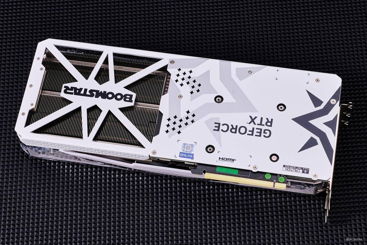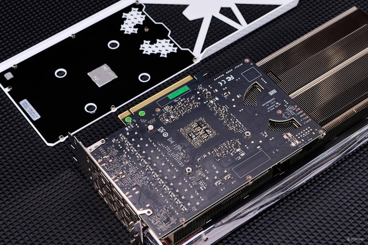 提到背板我们就来看一下背板部分,影驰RTX 4070 Ti SUPER星曜OC的背板采用了全金属材质,背板尾部采用了贯穿式开孔,有效地保障了显卡风道顺畅,进而提升散热效率。背板也贴有导热垫,进一步辅助PCB散热。