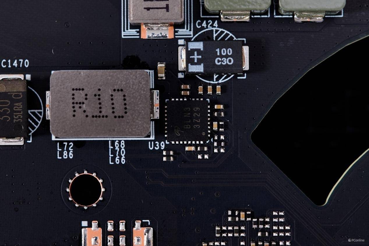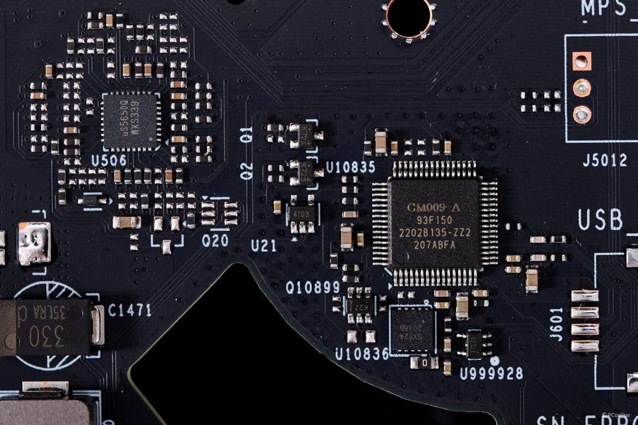 PCB正面还有一颗负责监控电压/电流/功耗的芯片,型号uS5650Q。还有一颗负责显卡RGB灯效控制的芯片,型号GM009A 93F150。