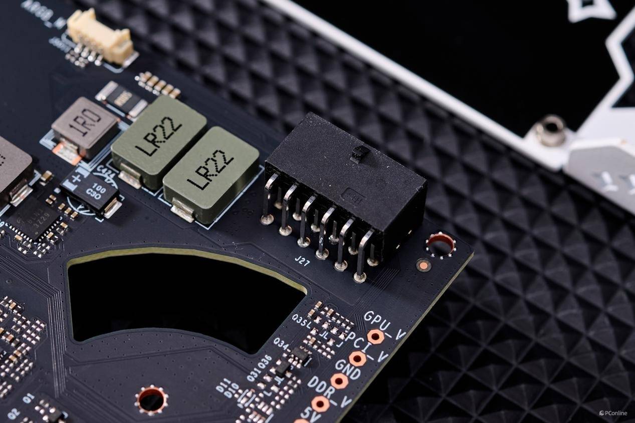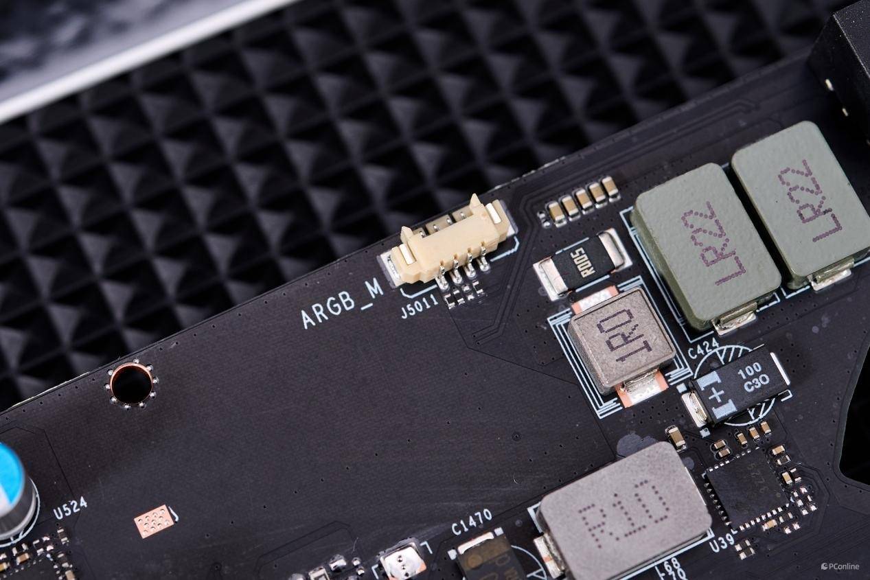 供电接口则是熟悉的12VHPWR接口,接口后配备有两颗LR22电容,保障显卡电源的稳定输出。并且PCB上还提供了5V ARGB 接口,支持与主板连接,实现光效一体联动。
