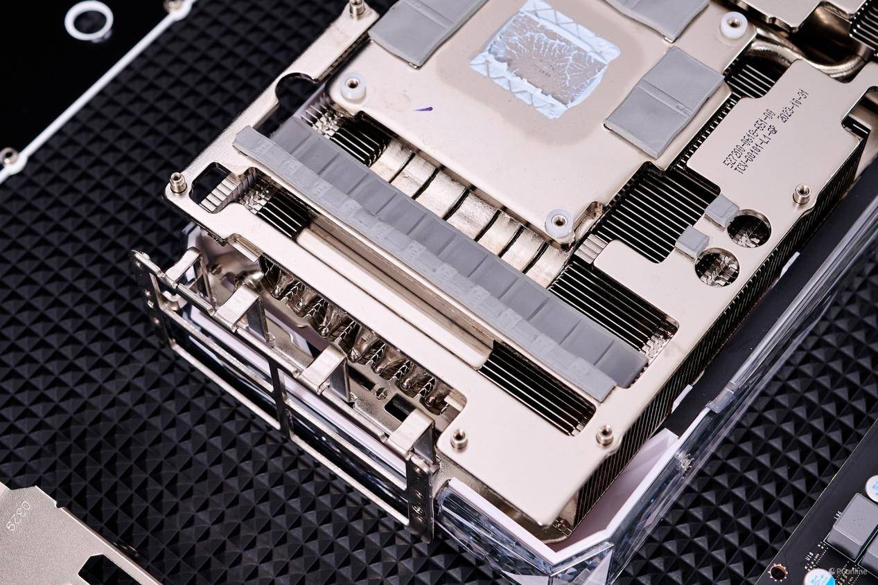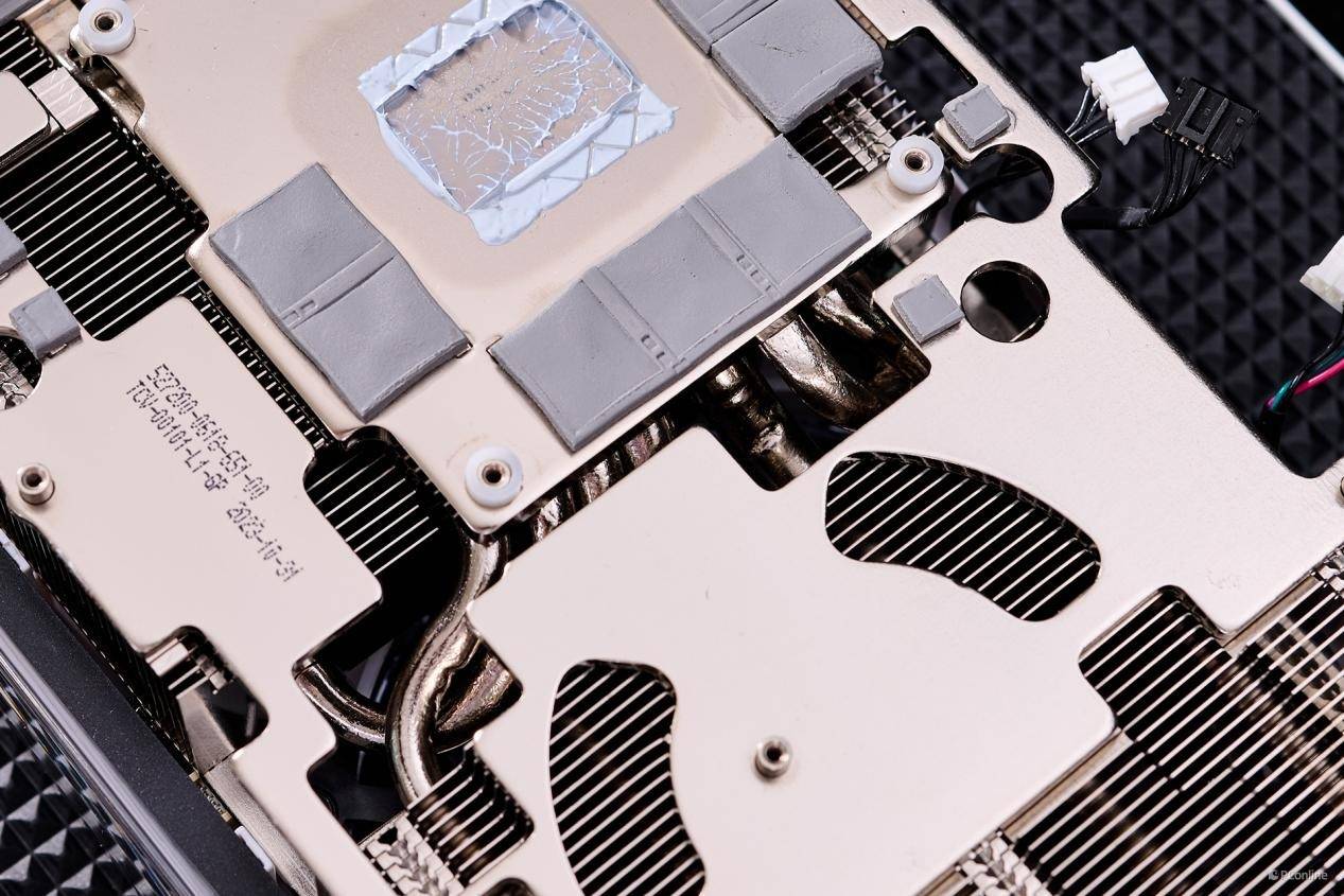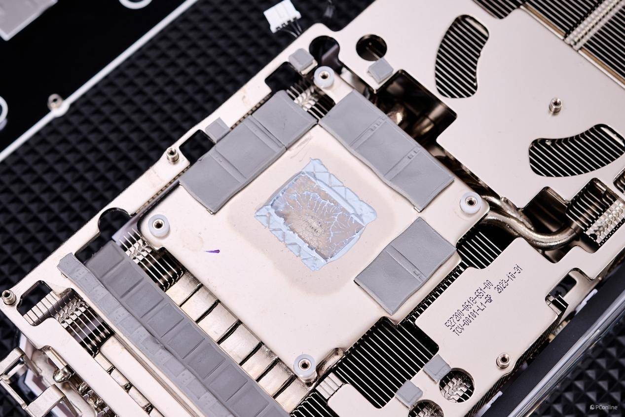 其采用了大面积高效能均热板直触核心的设计,显存和供电DrMos芯片处还覆盖有高导热系数的导热硅脂,将显存和供电芯片的热量高效传输到均热板上。