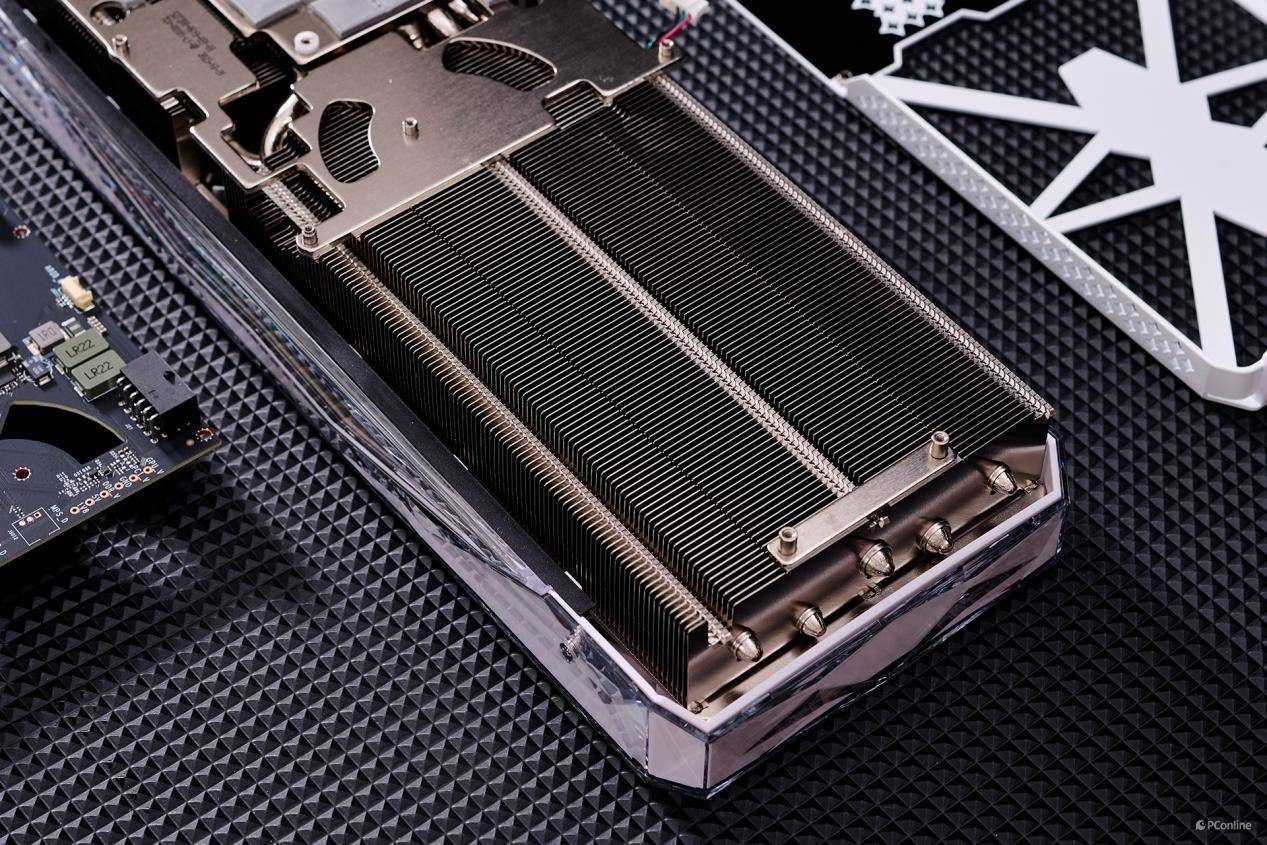 均热板上是2根8mm直径加5根6mm直径,总共7根镀镍热管的豪华散热规格,热管上覆盖了密集的散热鳍片,采用回流焊的工艺焊接,有着更好的散热性能。