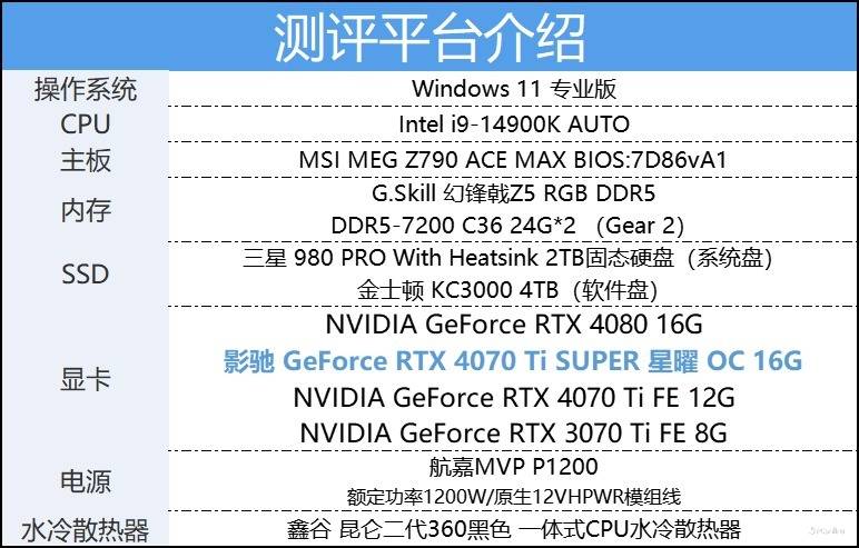 正式开测前,照例先介绍一下我们的测试平台,整体的配置依旧延续了我们前几天测试影驰RTX 4070 SUPER星曜OC时的那套顶级配置, i9-14900K处理器,MSI MEG Z790 ACE MAX主板以及DDR5-7200 C36的G.Skill 幻锋戟Z5,基本上是目前消费级别最旗舰的配置之一了,基本上不用担心会存在硬件瓶颈。