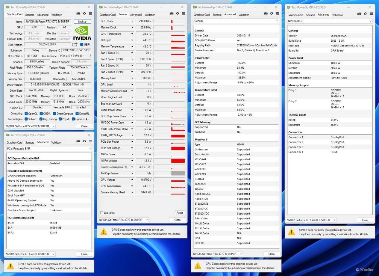 通过GPU-Z查询可以看到,影驰RTX 4070 Ti SUPER星曜OC的详细信息,基础频率为2340MHz,Boost频率可达2670MHz,TGP设定给到了360W。同时主板的Resizable BAR功能正常开启。