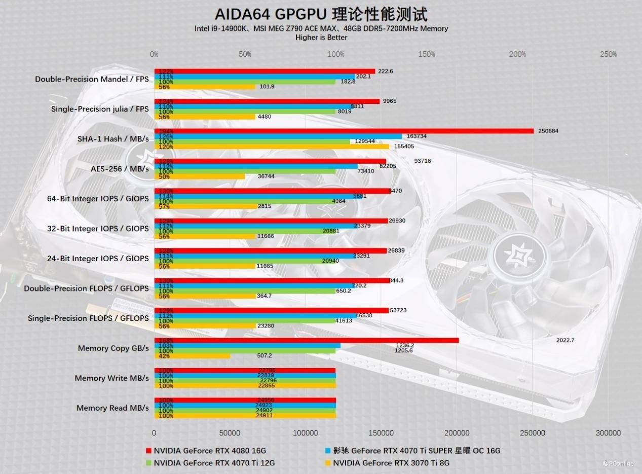 在AIDA64 GPGPU测试中,影驰RTX 4070 Ti SUPER星曜OC的表现和3DMark的测试成绩类似,整体的单精度和双精度浮点算力相比RTX 4070 Ti提升10%,落后RTX 4080同样为10%左右。