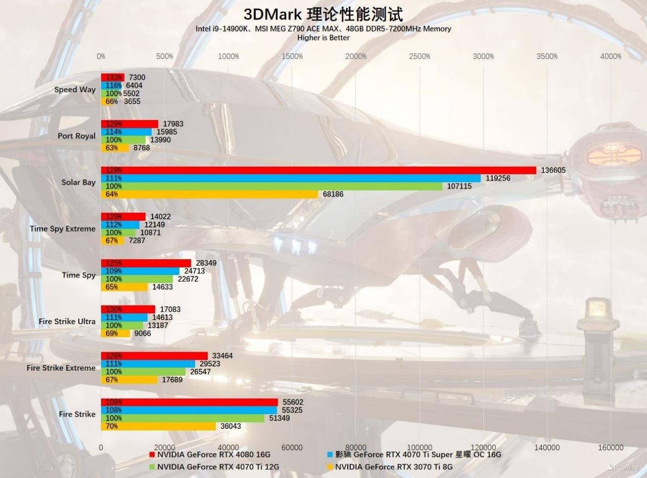 理论性能跑分,先来看下影驰RTX 4070 Ti SUPER星曜OC在3DMark各个项目中的表现。综合来看,影驰RTX 4070 Ti SUPER星曜OC相比RTX 4070 Ti 10%的CUDA核心数量提升,确实很好地反映在了实际的理论性能得分上,影驰RTX 4070 Ti SUPER星曜OC整体相比RTX 4070 Ti提升了大约10%,对比上一代的RTX 3070 Ti光栅性能有着65%左右的提升,光追性能提升幅度更是达到了75%,而相比规格更高的RTX 4080,平均仅仅落后了12%不到,虽然没有达成以下犯上的成就,但是这样的成绩已经相当喜人了。