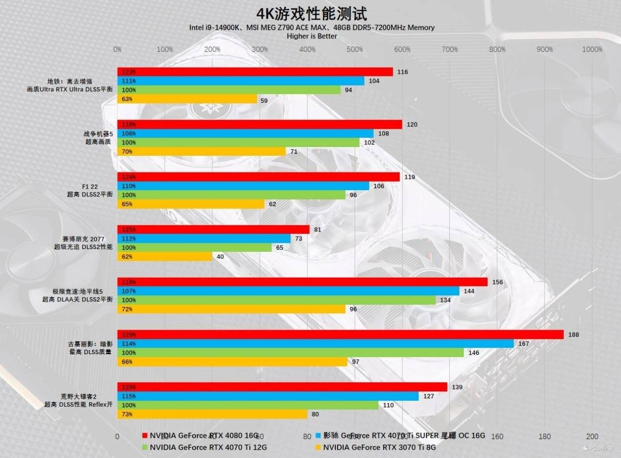 来到压力更大的4K游戏场景,16GB的大显存让影驰RTX 4070 Ti SUPER星曜OC在4K游戏中的表现更加游刃有余,在仅仅开启DLSS 2的情况下轻松地将画质拉满开启光追的《赛博朋克2077》平均73帧的流畅水平,相比RTX 4080落后幅度来到了10%,相比RTX 4070 Ti和RTX 3070 Ti,提升10%和66%。