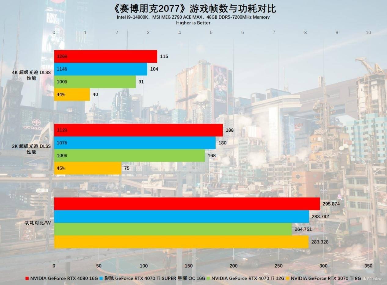 在《赛博朋克20777》中,影驰RTX 4070 Ti SUPER星曜OC在4K分辨率,最高画质,开启光线追踪的情况下,借助DLSS 3可以将游戏的帧率提升到100帧以上,如果愿意稍微牺牲一点画质,那么影驰RTX 4070 Ti SUPER星曜OC可以接近跑满4K 144Hz电竞显示器。并且,此时影驰RTX 4070 Ti SUPER星曜OC的平均功耗仅283W,表现十分亮眼。