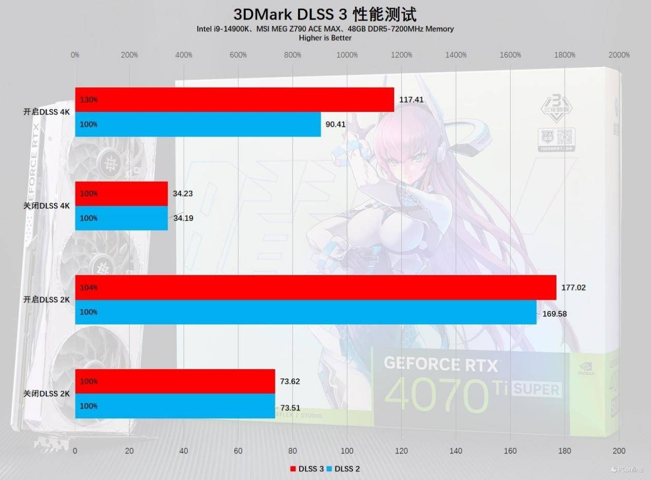 首先是DLSS 3,在3DMark DLSS 3理论性能测试中,影驰RTX 4070 Ti SUPER星曜OC在4K分辨率下开启和关闭DLSS 3的情况下差距能达到3倍以上。