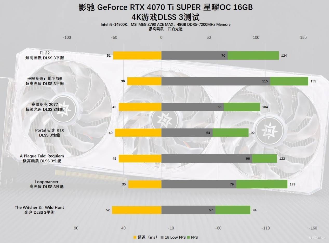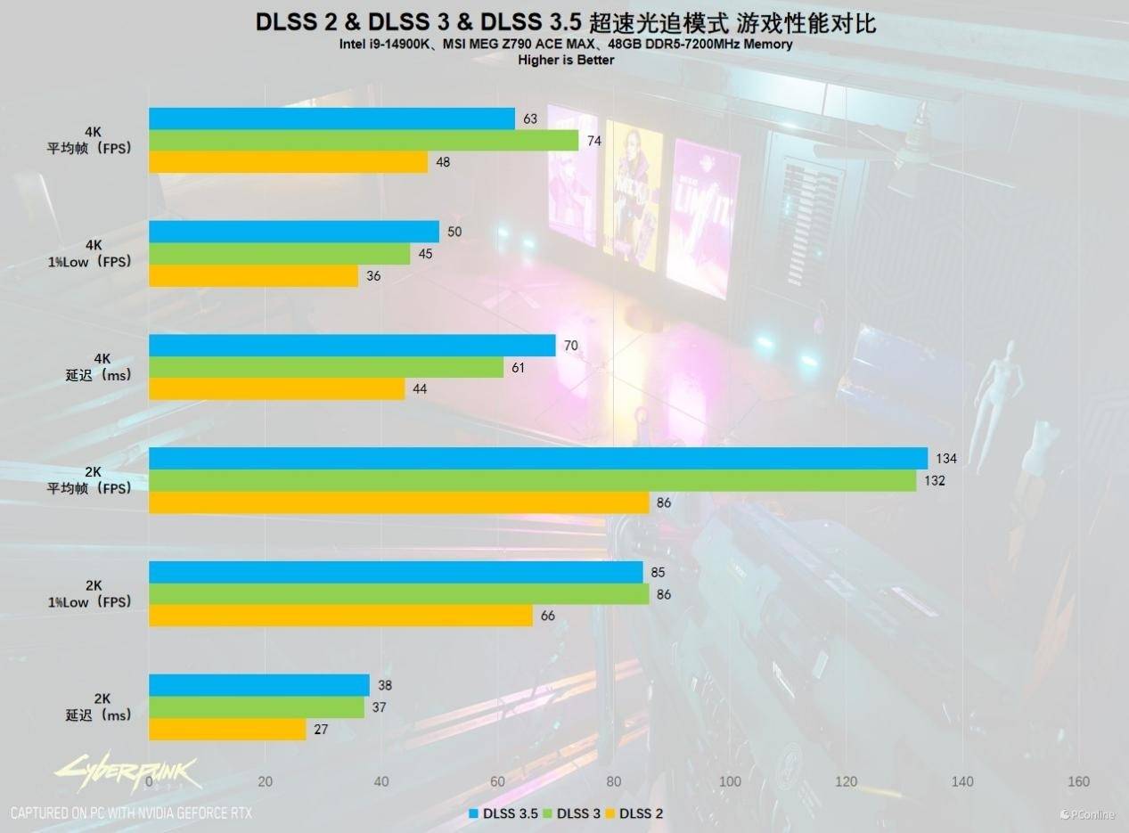 前面游戏的测试都是在没有开启DLSS 3的情况下测试的,而要知道RTX 40系列最亮眼,同时提升幅度最大的就是DLSS 3技术了,新加入的帧生成技术和NVIDIA Reflex技术,让游戏的帧率和延迟得到大幅度的改善。此外,前不久更新的DLSS 3.5,更是加入了光线重建技术,让游戏的光影和画质表现得到了大幅的升级。下面我们就来测试下影驰RTX 4070 Ti SUPER星曜OC开启DLSS 3和DLSS 3.5的性能表现。