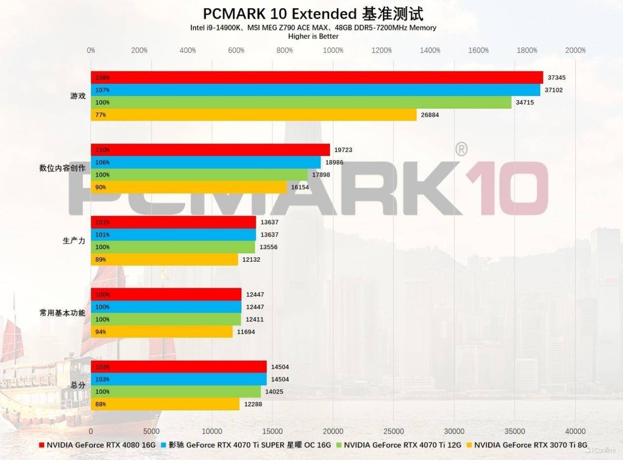 在PCMark10 Extended测试,影驰RTX 4070 Ti SUPER星曜OC整体要强于RTX 4070 Ti 3%,游戏项目领先幅度最大,为7%,和前面2K游戏性能实测的提升幅度一致,数位内容创作也有6%的提升。