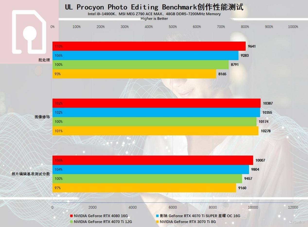 在ON1 Resize AI 2023测试中,影驰RTX 4070 Ti SUPER星曜OC将5张图片提升200%分辨率,用时仅37.69秒,仅比RTX 4080落后不到2秒,平均比RTX 4070 Ti快了4%。